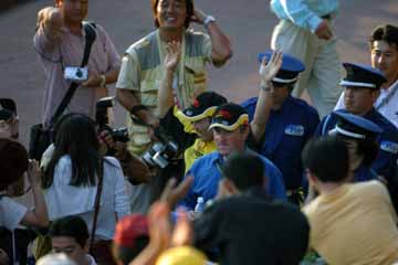| スタンドの声援に満面の笑みで応える佐藤琢磨。 | |