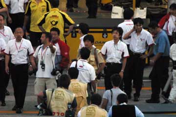 | ミナルディの演奏に注目している間にジョーダンのピットで動きが在る、注目の佐藤琢磨の登場か?。 |
