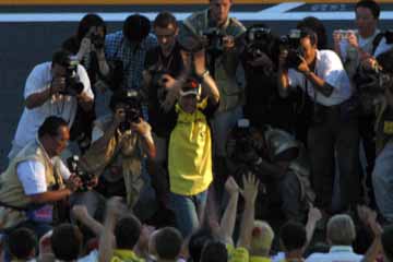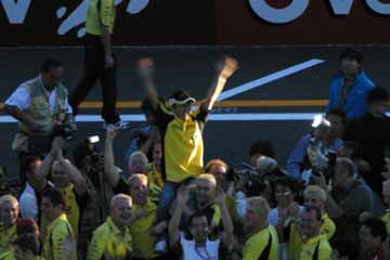 | 満面の笑みでグランド・スタンドのファンに挨拶する佐藤琢磨。 | |