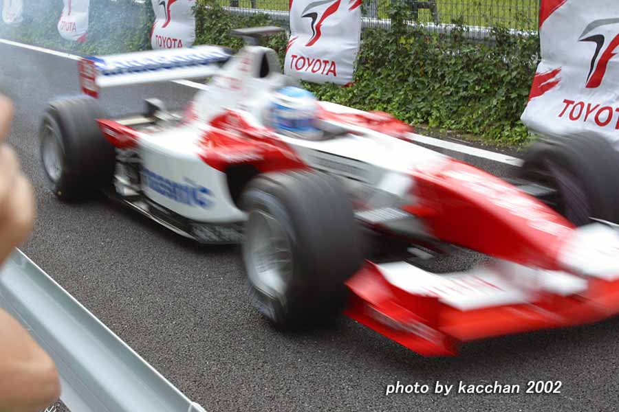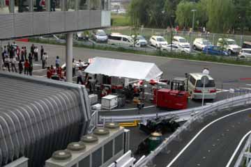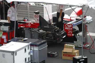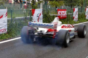 ガードレールを挿んで目の前を全開で走るF1、流し撮りする事も出来ずにシャッターを切るのみ。 イベントはあっと言う間に終了でも楽しかった。 帰る前に走行を終えたマシンを見ようと、覗ける場所を探す。 |