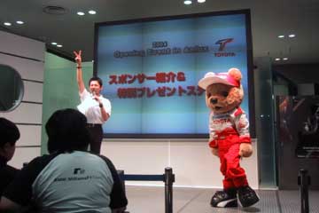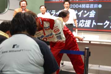思った通り2回共はずれ、運は先程の写真撮影で使い果たしたのか・・・残念。 オリビエ・パニスはサービス満点、子供にはウエアにサインの追加プレゼント。 しかし、『 そのウエアのネームはミカ・サロだぞ〜〜 』と得意のジョークも添えていたけど・・・。 (^ ^; 驚いたのは最後に最前列の女性ファンに自ら進み出てサインを行った事、更には隣に座って記念写真までも行う大プレゼント、彼女が熱烈なパニス・ファンなのに抽選に外れたのは見て判ったが何故?。 でも直ぐに判った!、今まで気が付かなかったけど彼女は少し体の具合が悪いらしいのだ・・・。 それに気付いたパニスがこんな行動を取ったのだ!、いい奴だな〜〜、彼女は感激して泣いていた。 色々なハプニングが在ったサイン会も終了、最後はドライバーと一緒の記念撮影会、限定5名だ。 どうせならこれに当選なら良かったのに・・・当然これもはずれ・・・。 ところがトラブル発生、サイン会終了と共に多くの観客が帰ってしまったのか当選者が現れないのだ。 |
