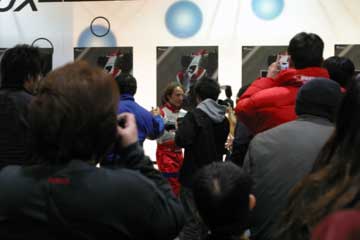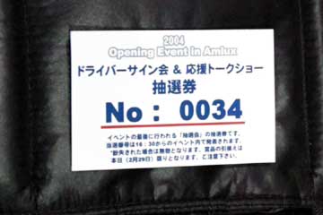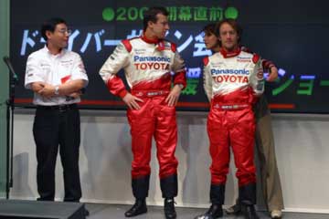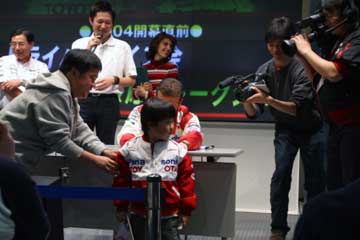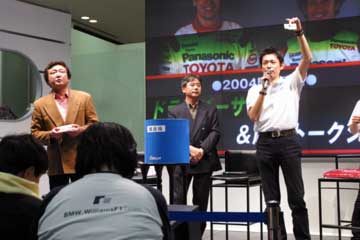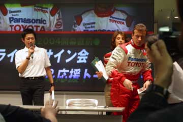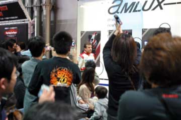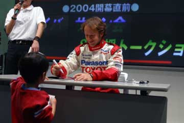先ず高橋敬三氏が今年の状況を説明、常時予選10位以内を明言、そしてその先を目指すと語る。 続いてパニスが抱負を語る、今年は150戦目を迎えるがそれに併せTOYOTA初優勝を目指す。 その間暇なダ・マッタが、ファンの声援に応えて手を振るなど、終始和やかな雰囲気で進行する。 次にダ・マッタの番になると質問に関係なく、場内後方のレースゲーム・マシンがブラジルには無い新作なのでやりたいと発言、場内大歓声で歓迎するが時間が無いのか実現しなかった。 その後には、パニスが前列のファンがTOYOTA以外のウエアを着ているのを発見して指摘するなどのハプニング続出、大爆笑の内に進行しアッと言う間にトークショーが終了。 そしてお待ちかねのサイン会開始、ドライバー1人づつでサインを行う。 最初はクリスチアーノ・ダ・マッタから、抽選で末尾の番号がが合った人のみサインを貰える。 |