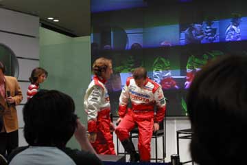 17時頃のドライバーの予定が遅れいるのか?再びトークが始まる、そして17時10分過ぎに。 いよいよオリビエ・パニスとクリスチアーノ・ダ・マッタの到着、予想外に後ろのエスカレーターから登場。 観客の大歓声を受けながらステージに移動する。 |