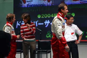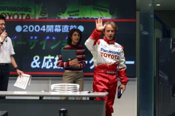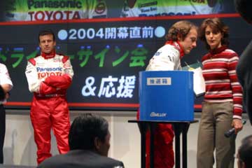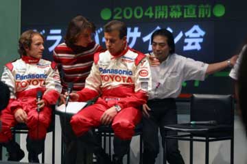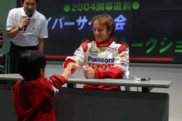 もう直ぐ2004年F1開幕!。 そんな2月の最終週末に、お台場でダ・マッタとパニスのトークショーが行われるのを知る。 (^ ^;; 直ぐに情報収集開始・・・、どうやら鈴鹿直前イベントのトークショーと同様に行われる様子。 (^ ^;;; しかし情報が混乱している?、お台場とアムラックス2通りの情報が流れているのだ?。 どちらが正しいのか・・・!、本当に両方で行うのね。 14時〜15時お台場のMEGA・WEBでドライバー・トークショー。 16時30分〜18時池袋のAMLUXでドライバー・サイン会&応援トークショー。 両方参加するには時間的余裕が在るのか?、調べるとなんとか間に合いそうだが・・・、おっと危ない。 良く見れば、サイン会は抽選で抽選券は16時30分の開始前に配布、と記載されている。 両方参加するのは無理そう、どちらを優先するか・・・と迷う事無く、サイン会に決定し写真を準備する。 籤運が悪いが可能性に賭けよう、1時間のサイン会ならかなりの確率で参加出来そうだ。 ( HONDAファンなのに、又もTOYOTAのイベントに参加です。 m(_ _)m ) 昨日のHONDAイベントの最終UPを行った後に12時30分頃出発。 日曜日なのでバスの便が少ない、更に電車も、予定を遅れて14時過ぎにAMLUXに到着。 急いで席を確保するが3列目!、余り人が居ない・・・どうしたのかな?、個人的にはそれは良いけど・・。 やはりF1は人気が無いのかな?、TOYOTAの主催イベントなのに?、それともファンはお台場かな?。 イベント開始まで暫し読書。 (指輪物語、旅の仲間第二巻突入) (^ ^; 14時30分予定に無いイベント開始、TOYOTA・F1のスポンサー紹介とプレゼントらしい。 早速ジャンケン大会開始、何時もながら直ぐに敗退、運は本番のサイン会の抽選に取って置こう。 |