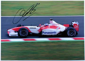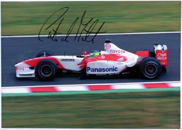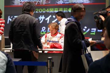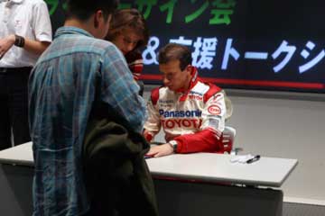 当選者が現れるまでの間、暫しトークショーで間を持たす。 混乱の中パニスがサインが欲しい子供を呼ぶ、その他にも近くの女性などにサインをプレゼント。 これはチャンス、急いで持参した昨年鈴鹿でのパニスの写真を取り出し掲げてサインの催促。 しかし・・・むさ苦しいオッサンではネ・・・パニスに無視されてしまった!。 それに気が付けば・・・何時も着ているTyrrellのブルゾンだった!、これでは無視されて当然か!!。 諦めかけた時思わぬ出来事が!。 なっ何と高橋敬三氏が近付いて来て、写真とサインペンを持って行くのだ。 思わず『 ダ・マッタの写真も有ります。 』ともう一枚差し出す・・・咄嗟の事ながら良く行動出来た物だ。 奇跡的出来事で運良くサインを貰えた、それも2人共だ!小さな声で『 やった! 』と呟く。 |