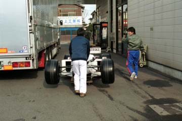 | 2001年2月25日 夕方、ディーラーの担当セールスマンより電話がある。 何事かと思えば、3月10日と11日に週末フェアのイベントとして、BAR・HONDAのF1マシンの展示があると言う。 そして、その展示の盛り上げに、私の持っている物を何か貸して欲しいと言うのだ。 早速OKと返事をすると、今度の土曜日に打ち合わせに来る事に、どうなる事やら。 2001年3月3日 2001年オーストラリアGPの予選を朝からスカパーで観戦、午後3時過ぎにセールスマンが来る。 しかし、担当セールスマンの他に所長も同伴、思わぬ訪問者にビックリ! 話を聞けば、F1マシンを本社より借りたがその他の用意を検討した所、F1ヲタク?として有名な??私の名前が挙がったらしい。 色々話した後、今まで撮ったHONDAマシンの写真(カラープリンターのプリントアウト)を30枚、ワイド四切サイズのパネルで用意する事に。 さらに、1/43のミニチュアカーをディスプレイする事に決まった。 セールスマンが帰った後、直ぐに用意を始める。 ミニチュアカーは昔おまけでもらった16台用のケースに並べる、HONDAのみでは色合いが寂しく無限HONDAも入れて完成。 写真額30枚を買いに出かけるが当然在庫が無く予約、プリント用紙とインクを購入、・・・おっと領収書をもらっておかないと。 2001年3月9日 プリントが終わらず、有給休暇をもらい朝から作業、なんとか30枚プリント終了 セールスマンが取りに来る予定だが、F1マシンの搬入を見学しに行きながら届けると連絡、すると3時からとの事。 夜の搬入と思っていたら以外に早い時間・・・まずい、未だ写真額を取りに行っていない。 急いで取りに行きその後は額装作業、意外に手間取り終了時には2時半頃、直ぐにディーラーに急行。 なんとか3時頃に到着、すでに搬送車が到着しており作業中。 急いで取材開始。 |