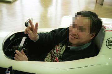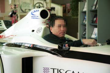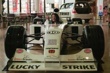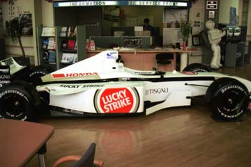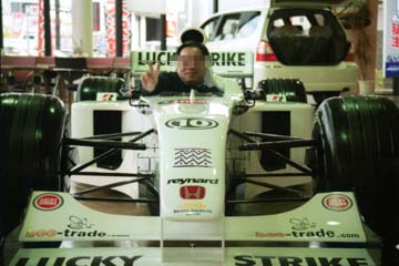 | 運び込まれたBAR・HONDA、BAR001を今年のカラーリングにリペイントした物。 残念ながら展示用のレプリカでした。 | でも、おかげで乗れる事に、本物なら触れないとの事。 |