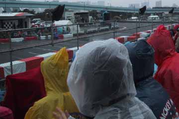 | イベントの開始を待っていると次第に空が暗くなり、やがて雨が降り始める。 係員が巡回し『スタンド内では傘はご遠慮下さい。』と告げる。 確かにサーキット内のマナーでは傘は迷惑になるので私はポンチョを持参したが、今回はそれを知らないで濡れてしまう人も出る。 暫らくすると雨は強くなり、何人かの観客はスタンドを出て傘を差し見学、又帰る人も出始める。 最上段の席に空席を発見、急いで場所を移動する、これで周囲に迷惑をかけずに撮影が出来る。 |