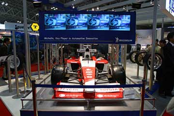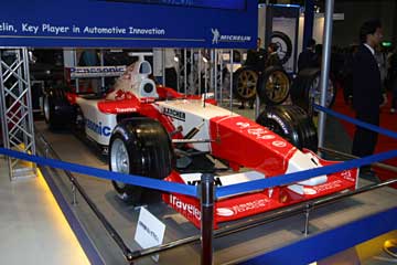 TOYOTAは今年のマシン、TF103前期型の様だ。 ( 鈴鹿では、サイド・ポンツーン後部の処理がフェラーリに酷似した形状の後期型になっていた。 ) TOYOTAのF1マシンはミシュランのブースにも展示されていた。 |