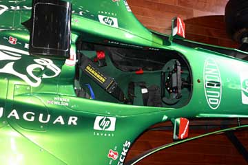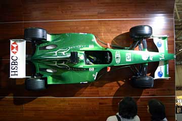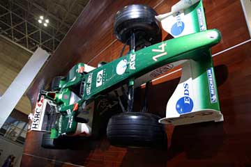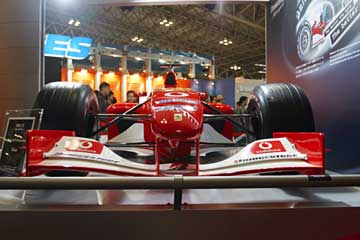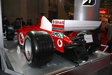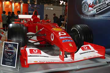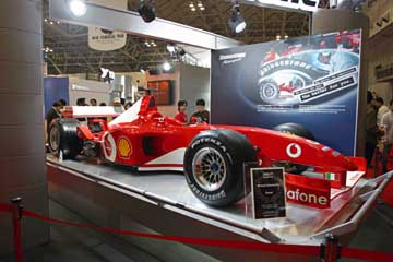 直線的なフロント・ノーズ形状から見て、2001年のR2らしい。 さらに細部の作りから展示用のレプリカ?と思う、流石に実車は触れる場所に展示しないでしょうから。 次に紹介するのはブリヂストンのブース、当然フェラーリを展示している。 |