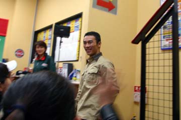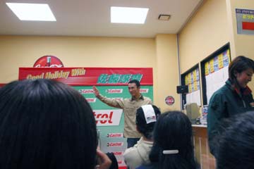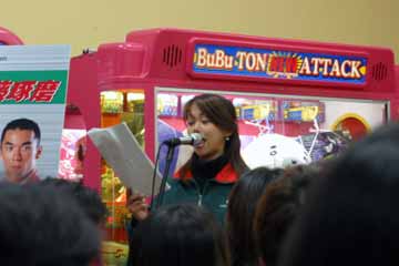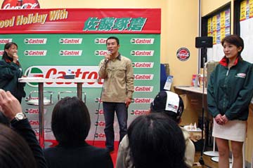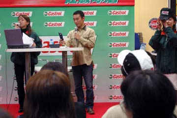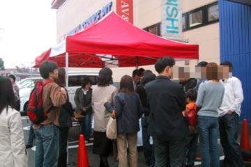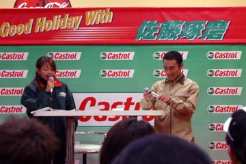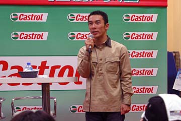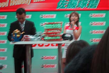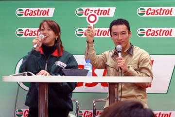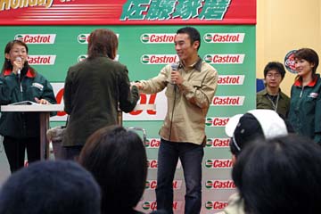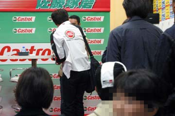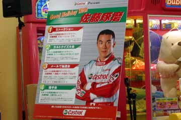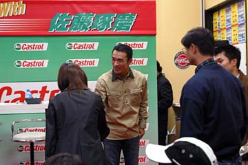 | 2003年11月09日 Good Holiday With 佐藤琢磨 編 佐藤琢磨イベント第2弾!、行って来ました!!。 今度はカストロール主催のイベント、実は祝日の11月03日にも開催していたのだが、ちょっと遠いので断念していた、二日続けてでは疲れるし雨模様の天気だったので・・・。 ( この軟弱者! ) 9日は3箇所でイベントを行うらしいが、その2回目が私の直ぐ近所で行われるのだ!。 これは行かない訳には行かない・・・と思ったら、今日も怪しい天気?でも今度は絶対に行くぞ。 当初、14時30分の開始で参加者多数の場合は入場制限するとの事で、13時入りを予定していた。 しかし、会場となるスーパーオートバックスのイベント情報を検索すると、11時までに指定席の抽選を受け付ける事になっている、念の為に早めに行く事にする。 10時出発し投票所へ・・・ (^ ^; 、それから会場の有る場所へ向かう。 本来なら車で行く場所だが、駐車場に入れないのを心配して電車で行く事に、10時40分頃到着する。 会場到着と同時に指定席の抽選に申し込む、・・・余り人が居ない様だが、F1人気がない為か?。 11時になっても人が少ない、受け付けを暫らく延長する様子だ、寂しい・・・。 人が多すぎて見れないのも困るが、人気が無さ過ぎるのも悲しい、F1ファンとして微妙な心境になる。 11時30分頃に受付終了し12時に当選者発表、無事指定席をゲット一安心、13時からイベント開始。 |