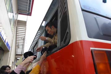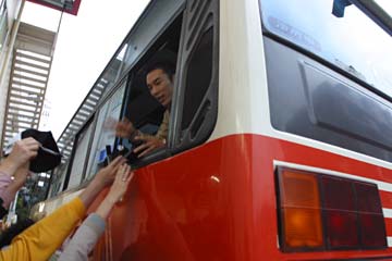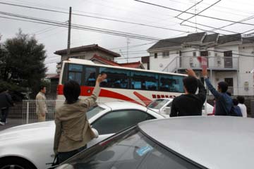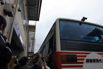 今回の握手会では個人的サイン禁止、スタッフの厳重な監視の元で行わた為、写真を用意するも断念。 その後、余った写真は近所の琢磨ファンにプレゼントしたのだが、大変に喜ばれて良かった。 イベント終了後に直ぐに移動、次の会場に向かう琢磨を送る。 しかし、指定席からの移動で出遅れ、移動用の大型バスは既に大勢のファンに囲まれていた。 時間の許す限りファン・サービスを行う佐藤琢磨に感心!。 |
