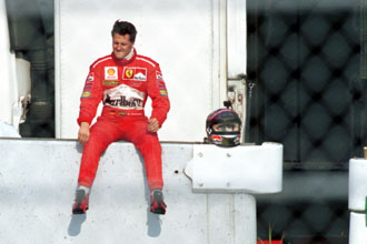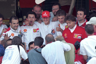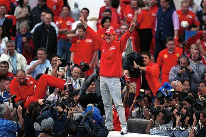 2000年R16 鈴鹿 優勝 PPを獲得したミハエルであったが、スタートでミカ・ハッキネンがロケット・スタートで1コーナーを征する。 しかし、ここからがミハエル+フェラーリの本領発揮、小雨の中40周目のピットインでミカ・ハッキネンを逆転、フェラーリ念願の21年ぶりのドライバーズチャンピョンを獲得する。 総合順位 1位 |