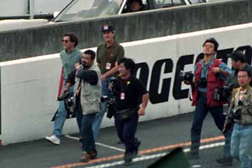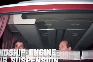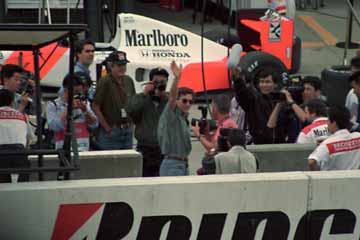 | 何時もファン・サービスを忘れないアイルトン・セナ。 | 木曜日で観客が少いグランド・スタンドを中央突破するが・・。 |