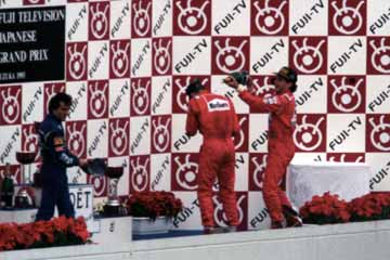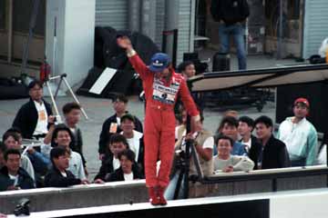 | プロストを無視してハッキネンと盛り上がるセナ。 | 最後に再びグランド・スタンドのファンの声援に応える。 |