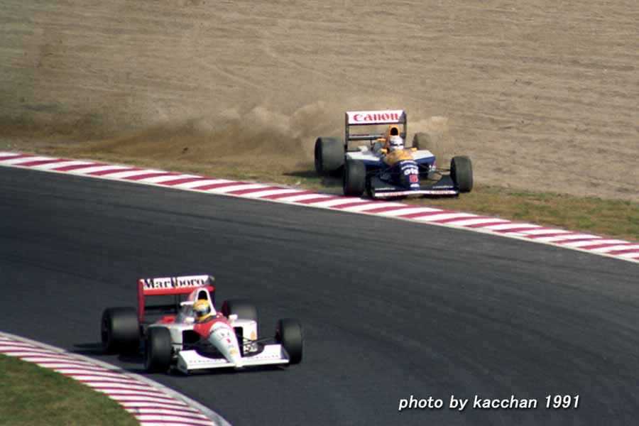 スタート直後の1コーナーで接触両者リタイア、2度目のワールド・チャンピョンになる。 私はスプーンで決勝を観戦していたので、フォーメーション・ラップしか見れなかった。 (T_T) 総合順位 1位 1991年 鈴鹿 2位 ウイリアムズのナイジェル・マンセルとチャンピョンを争う。 |