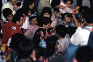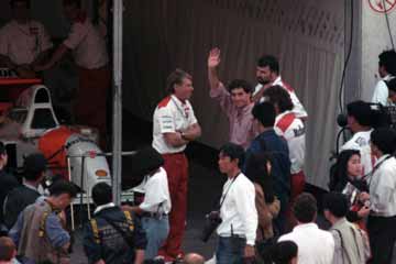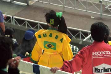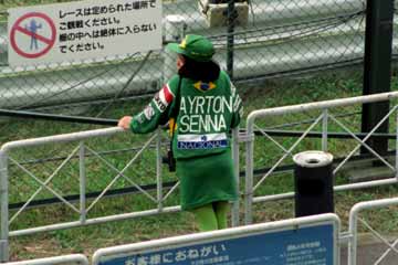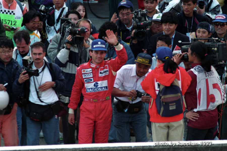 | 金曜日ダンロップ・コーナー。 | レース後ファンに挨拶するアイルトン・セナ。 |