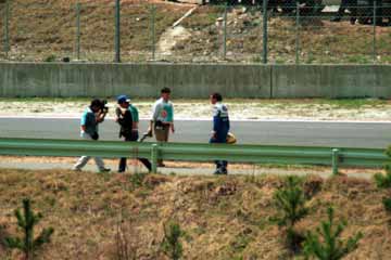 | フリー走行でいきなりストップ、ダンロップ・コーナー。 | ウォーム・アップ走行で挨拶するセナ、S字コーナー。 |