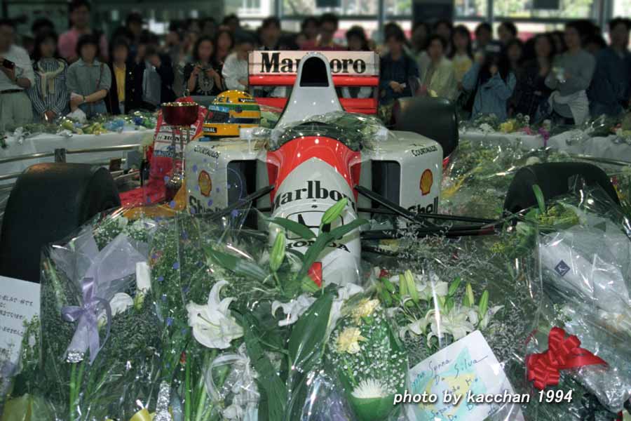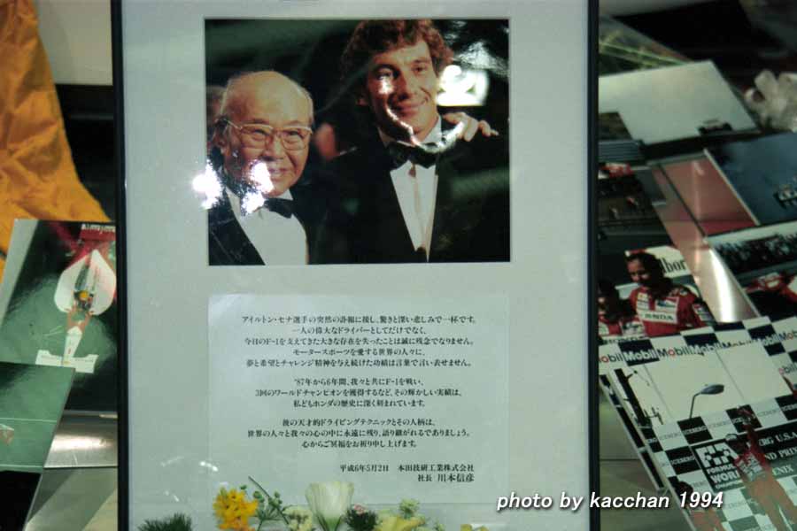 英田のレースはスタートでいきなりのリタイアに、アイルトン・セナの何かが変だ。 1994年5月1日 運命の日。 余りの出来事に暫し呆然、声も出ない・・・。 1994年5月8日 翌週、絶頂期を支えたHONDAの青山本社にセナの追悼に行く。 |