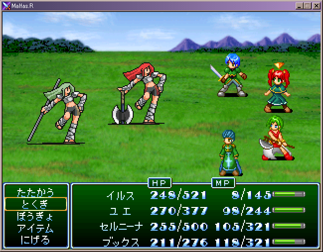 Malfasは「軽い」のがモットーだったので、RTPをふんだんに使ってます。 なので、これらを全部配布素材にとっかえて、さらに自作メニューにして、サイドビュー戦闘にして・・・。 もちろん、シナリオも練り直しますが。 これだけやれば、まぁリメイクする価値もあるんじゃないかと。 時間はそんなに無いですが、毎日少しずつ作っていく予定です。