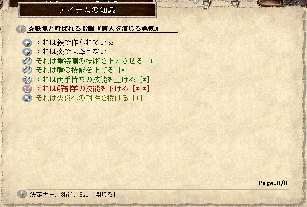 ↓ここんとこ、elonaというゲームにはまってしまって・・・。 上位の装備品にはランダムで(ぶっ飛んだ)名前がつくんですが、その中からちょっと面白いのをチョイス。 まぁ・・・「演じる」には勇気が必要かな^^;