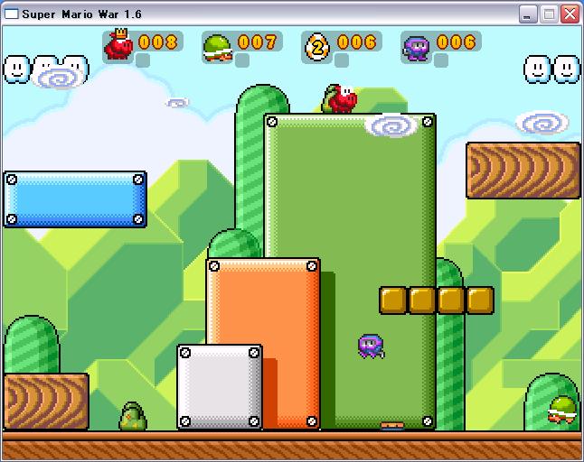 「Super Mario War」というゲームです。 各所で紹介されてるから知ってる方もいるかもしれませんが。 どんな内容なのかといえば、要は相手をひたすら踏み潰して、生き残った人が勝利というバトルロワイヤルです。 アイテムを使って相手を倒すのもアリです。 お馴染みのファイアボールとか、ハンマーとかマリオに関係するものが色々あります。
